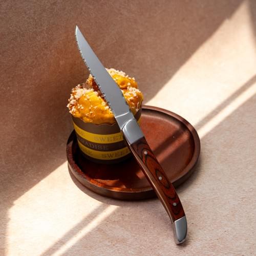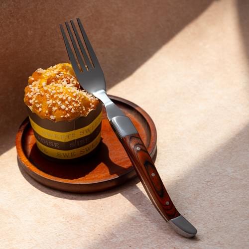 The fork, on the other hand, offers smooth, well-polished tines that are perfectly spaced for effortless spearing and enjoying of food. Its Paraberlinia bifoliolata handle harmoniously balances the sharpness of the tines, creating a cohesive and visually appealing piece.