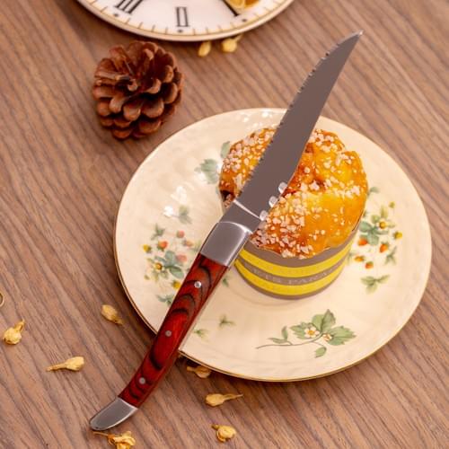 The knife in this set boasts a sharp, durable blade that gleams under light, ensuring precision and ease of use when cutting through various foods. Its design complements the sleek wooden handle perfectly, making it a versatile tool for any dining occasion.