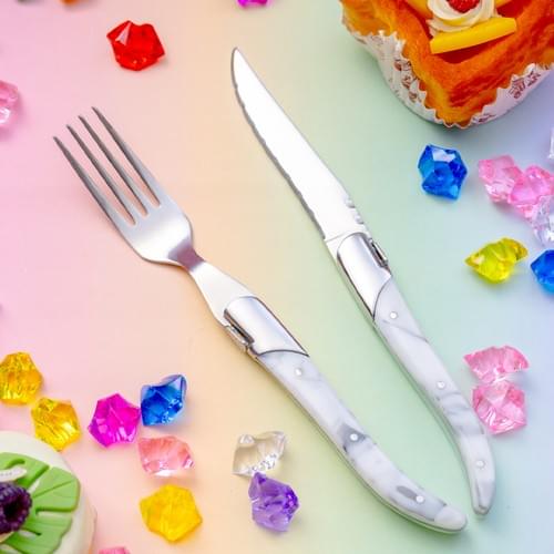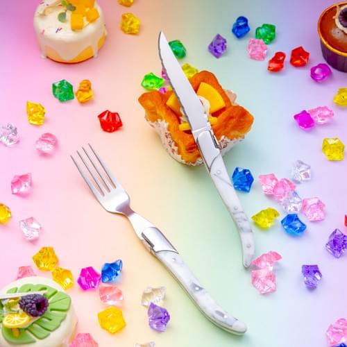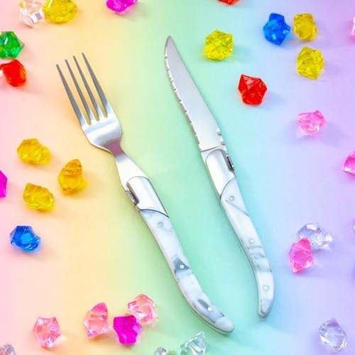 This exquisite cutlery set features a knife, fork, and spoon, each adorned with elegant faux marble acrylic handles that exude sophistication and style. The smooth, polished stainless steel heads ensure durability and a pristine dining experience, while the ergonomic handles provide a comfortable grip, making them ideal for both everyday meals and special occasions. The stunning marble-like pattern on the handles adds a touch of contemporary chic to any table setting, blending seamlessly with various decor styles. Perfect as a gift or a personal treat, this set elevates dining aesthetics with its unique design and practical functionality.