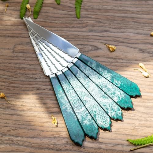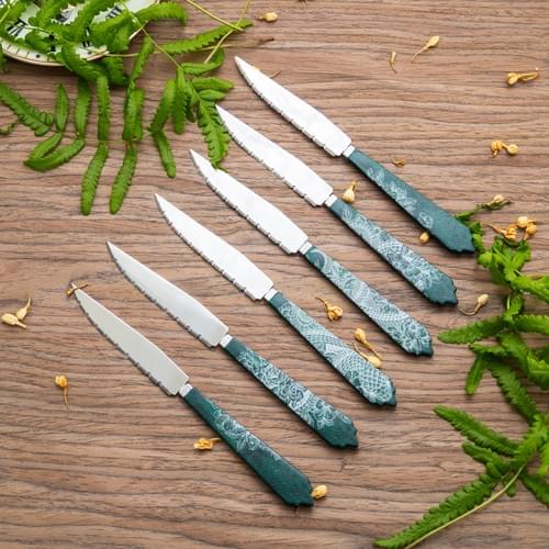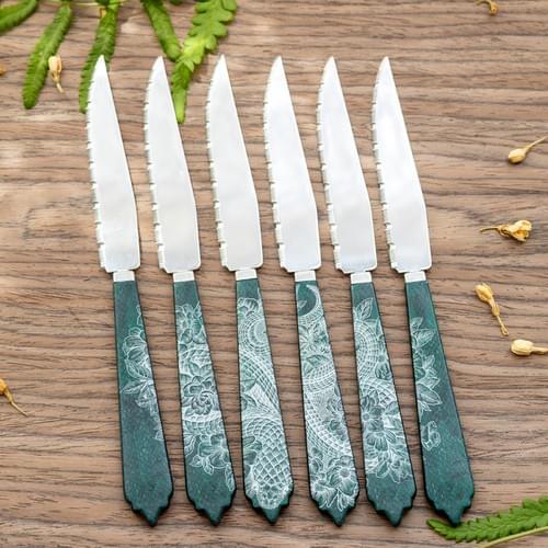 The Serpent Bloom steak knives feature hand-finished stainless steel blades paired with intricately engraved handles, blending the mystique of the serpent with the timeless beauty of blooming flowers.