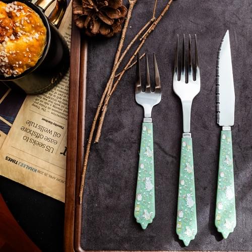 This series features double-sided printed handles adorned with soft pastel illustrations — playful animals, tiny flowers, and gentle green tones that bring a light, dreamy atmosphere to any table.
