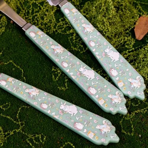 This series features double-sided printed handles adorned with soft pastel illustrations — playful animals, tiny flowers, and gentle green tones that bring a light, dreamy atmosphere to any table.